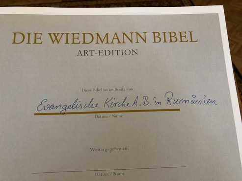 The surprise was huge when she received an email a few weeks ago. Martin Wiedmann asked if the Evangelical Church Romania would give him the honor to accept the Wiedmann Bible ART-Edition as a gift from him. Erika Klemm did not have to think twice. The EKR is a German-speaking Church in Romania.